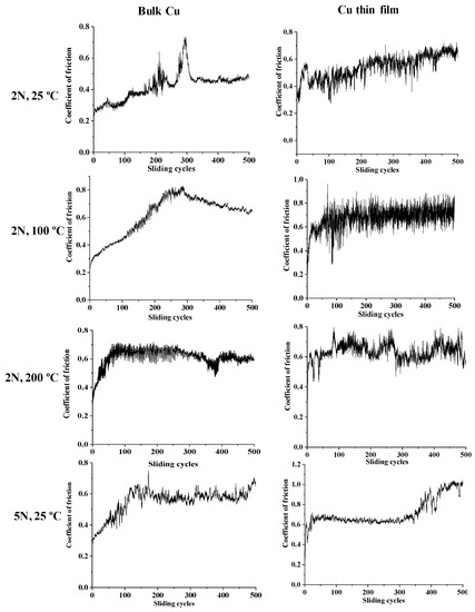 In what concerns the tribological properties, the coefficient of friction of copper, in bulk and as thin film were measured at different temperatures and loads for reference purposes. The results are present in Figure 6.