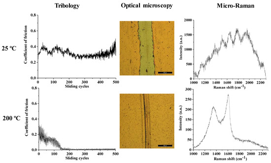 The study of the Cu-C100 system (Figure 9) shows a more distinct behavior than the one observed for the thinner carbon thin films. At the end of the tests, the carbon thin film is present in the wear track, although much more visible after the test at 200 °C than at room temperature. At room temperature, the coefficient of friction is relatively constant and around 0.3, without the increasing tendency, observed in the previous coatings, although with a less sharp profile. This may be a consequence of the higher thickness of the carbon coating although it is noticeable by the optical micrograph that the majority of the coating has been removed after the 500 cycles. At higher temperatures, the coefficient of friction decreases during the first 150 cycles, similarly to what occurs in Cu-C60, but it does not remain around 0.001 as for Cu-C60 coating. Instead, it starts to rise, although from the optical observation and from the Raman spectra it is clear that the carbon coating is still present.