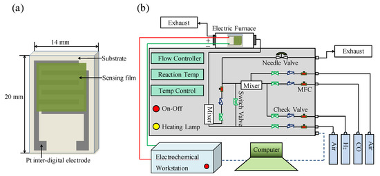 Schematic diagram of (a) the sensor component and (b) the gas sensing measurement system.