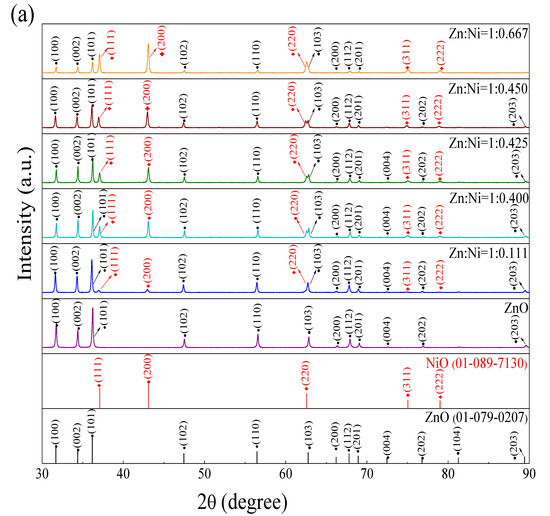 where the wavelength λ of X-ray was 0.1542 nm; θ is the Bragg diffraction angle (θ); and β is full width at half maximum, which was calculated based on the most intense peaks of ZnO and NiO in Figure 2b. The peaks of (100), (002) and (101) planes for ZnO and the peaks of (111) and (200) planes for NiO were considered to evaluate the crystal structure factors, as summarized in Table 1. The average grain sizes of ZnO and NiO in ZnO–0.425NiO composite were obtained as 63.42 and 44.61 nm, respectively, which illustrate the formation of nanostructured materials.