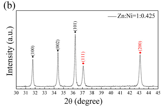 The grain sizes of ZnO and NiO in ZnO–0.425NiO were evaluated using theoretical Debye–Scherer equation (Equation (1)).