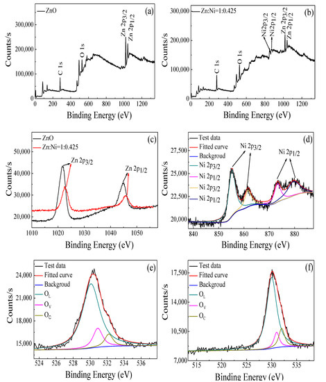 XPS survey spectra of ZnO and ZnO–0.425NiO annealed at 550 °C: (a) full spectra of ZnO, (b) full spectra of ZnO–0.425NiO, (c) Zn 2p spectra of ZnO and ZnO–0.425NiO, (d) Ni 2p spectra of ZnO–0.425NiO, (e) O 1s spectra of ZnO, (f) O 1s spectra of ZnO–0.425NiO.
