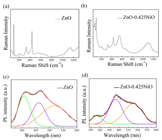 Raman spectra of the (a) pristine ZnO and (b) ZnO–0.425NiO composite annealed at 550 °C; photoluminescence (PL) spectra of (c) pristine ZnO and (d) ZnO–0.425NiO composite annealed at 550 °C.