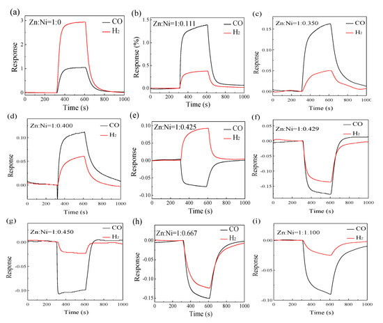 Responses of ZnO (a) and ZnO–xNiO (x = 0.111, 0.350, 0.400, 0.425, 0.429, 0.450, 0.667, 1.100) (b–i) annealed at 550 °C to 400 ppm CO and H2 at the operating temperature of 350 °C.