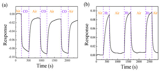 The sensing reproducibility and stability of ZnO–0.425NiO to CO and H2 were analyzed. Figure 7a,b depicts three cycles of gas sensing response curves of ZnO–0.425NiO annealed at 550 °C to 400 ppm (a) CO and (b) H2 at the operating temperature of 350 °C, respectively. The results indicate the reproducibility and stability of such behavior. It is worth noting that the process conditions for reproducibility of such results requires a high accuracy, and when any of the factors affecting gas sensing behavior (p-type or n-type), including concentration of sensing materials, operating temperature, etc., changes, then the critical value x for the p–n transformation might be changed. In addition, the heating mode of the sensor which is heating the substrate [62] or the whole gas sensing detection chamber [63] may also affect the gas sensing behavior.