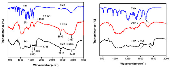 Fourier transform infrared (FT-IR) spectra of (a) TMX, (b) CNCs, and (c) nanoformulation (TMX-CNCs).