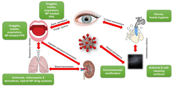 It is known that very small metal NPs (<10 nm) are able to go through the cell membrane and inhibit post-attachment virus replication [80]. As an example, it was recently reported that a nanotechnology-based solution containing titanium dioxide and silver ions was used for street disinfection in Milan, Italy [81].