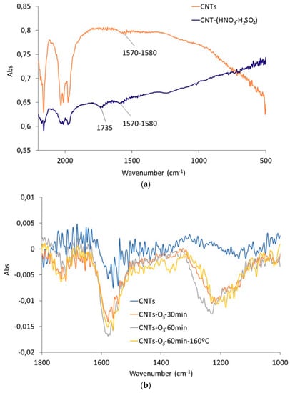 CNTs treated with H2SO4-HNO3 and CNTs treated with O3 and O3-NaOH were characterized by IR spectroscopy to identify chemical groups on the CNTs surface (Figure 2a–c). Both H2SO4-HNO3 and O3 treatments produced the formation of polar groups containing oxygen on the CNTs’ surface [45]. Figure 2a includes the IR spectra (amplified scale from 500–2200 cm−1) of the original CNTs and those treated with HNO3-H2SO4. The main difference in the IR spectra in Figure 2a is the presence of a band at 1735 cm−1 identified in the IR spectrum of the CNTs treated with HNO3-H2SO4, which may be ascribed to C=O groups, due to the oxidation of the CNTs’ surface. This band is not observed in the IR spectrum of the original CNTs. On the other hand, Figure 2b includes the IR spectra corresponding to the CNTs treated with O3 for 30 and 60 min at room temperature and for 60 min at 160 °C. The amplified scale in the range 1100–1800 cm−1 can identify the oxygen-containing groups introduced as a consequence of the O3 treatment and not present in the original CNTs, mainly with the presence of the bands at 1200–1230 cm−1 ascribed to C-O-C stretching and/or arC-OH, and a lower relative intensity band at 1720–1730 cm−1 due to C=O stretching bonds. The broad band with a main peak centered at 1550–1580 cm−1 may be ascribed to C=C stretching bonds, typical of the CNTs’ backbone. Comparison of the relative intensity of the bands indicates that there are no significant differences among the O3 treatments, only showing a slight increase in the intensity of the band at 1550–1580 cm−1 for the CNTs treated for 60 min. The O3 treatment carried out at 160 °C does not produce an increase in the oxidation degree compared to the modifications produced by the O3 treatment at the same time (60 min) at room temperature. These bands indicate that the oxidation produced by the O3 treatment may be predominantly due to the introduction of phenolic and ether groups on the CNTs surface. However, the liquid acid treatment on CNTs mostly leads to the incorporation of C=O groups. No further differences could be determined due to low signal intensity obtained by IR spectroscopy for CNTs and its qualitative nature, which does not allow a precise data interpretation.