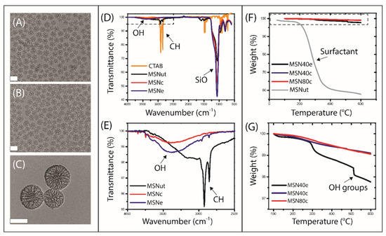 Transmission electron micrographs of (A) MSN40c, (B) MSN40e and (C) MSN80c, where scale bars represent 50 nm. (D) Infra-Red Attenuated Total Reflection (IR-ATR) spectra of templating surfactant (CTAB; yellow curve), MSNut (black curve), MSNc (red curve) and MSNe (blue curve), with (E) inset of localized region highlighting the presence of OH and CH groups in various MSN. (F) Thermogravimetric curves for MSNut (grey curve), MSN40e (black curve), MSN40c (blue curve) and MSN80c (red curve), with (G) inset highlighting the degradation within treated MSN. MSN, mesoporous silica nanoparticles.