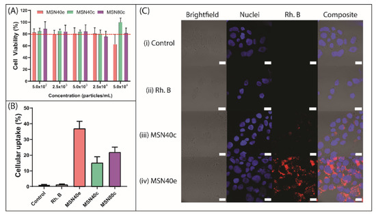 Cytotoxicity screening of MSN was performed using the MTT assay in Caco-2 cells, where MSN exhibited cell viability ≥ 80% at concentrations of up to 2.5 × 104 particles/mL (Figure 2A). Cellular survival of 80% is considered the accepted threshold for cell viability [43] and, thus, MSN at concentrations ≤ 2.5 × 104 particles/mL can be considered non-toxic. At 5.0 × 104 particles/mL, MSN40e triggered a cellular viability of 62.6 ± 16.5% and can therefore be considered marginally toxic at this concentration. This could be attributed to either (i) a higher density of silanol groups present on MSN40e, compared to MSN40c and MSN80c, since silanol groups have been shown to interact with cellular membrane components, triggering cell lysis and death [44,45,46,47], or (ii) increased particle uptake for MSN40e (Figure 2B) and, thus, increased exposure to CTAB residues within the MSN. However, since all particle concentrations used in the cellular uptake and intracellular infection assays were below 2.5 × 104 particles/mL, the MSN can be safely considered non-toxic to the Caco-2 cell line.