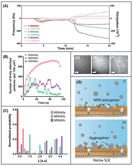 The aggregation of MSN was increasingly evident for MSN40c and MSN80c, which both exerted complex particle adsorption profiles, whereby increases in particle adsorption were followed with rapid decreases in particle counts (Figure 3B). Since the maximum number of counted particles/aggregates adsorbed onto the snSLB surface was reduced for the calcined MSN samples, it does not indicate that fewer individual MSN particles diffused to the surface, but rather the more hydrophobic MSN had an increased propensity for particle aggregation. These findings correlate well with QCM-D analysis, whereby the continual decrease in f and increase in D can be attributed to the formation of large aggregates on the SLB surface. Interestingly, evidence of MSN40e aggregation on the SLB is not apparent for MSN40e during QCM-D experiments, which suggests that aggregation may be influenced by the flow of media (QCM-D was performed under flow conditions, whereas TIRF was static) or the presence of proteins and carbohydrates within the SLB. To further indicate aggregation on the snSLB surface, analysis of adsorbed MSN fluorescence intensity (If) highlighted an increase in mean intensity for both calcined MSN, compared to MSN40e (Figure 3C). Since fluorescence intensity has been shown to scale with particle size [57], it can be concluded that MSN40c and MSN80c formed significantly larger aggregates on the snSLB surface, compared to MSN40e, which is hypothesised to be driven by hydrophobic forces between individual nanoparticles (Figure 3G).