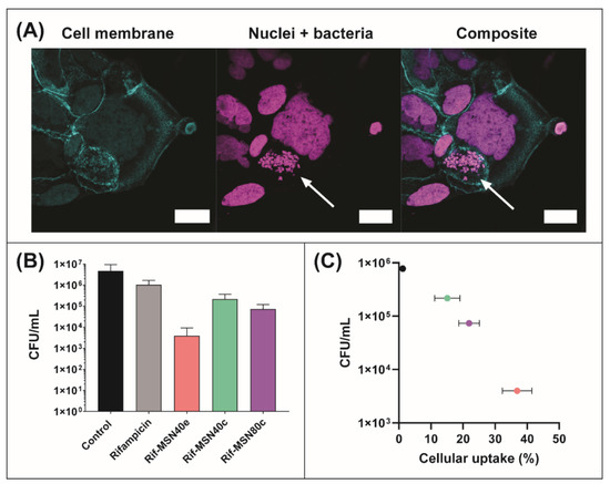 (A) Laser scanning confocal fluorescence micrographs of SCV S. aureus-infected Caco-2 cells. SCV S. aureus and nuclei were labelled with DAPI (magenta) and the cell membrane was labelled with Alexa-488 (cyan). Intracellular pathogens are highlighted by the arrow. (B) Efficacy of the following rifampicin formulations in the reduction of intracellular SCV S. aureus within Caco-2 cells: rifampicin solution (grey bar), MSN40e (pink bar), MSN40c (green bar), and MSN80c (purple bar), relative to a control group (i.e., no treatment; black bar). (C) Colony forming units of intracellular pathogens as a function of cellular uptake of each formulation (from data already presented).