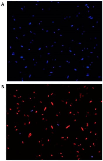 The antifungal activity of rGO-CuO NPs against the FORL isolate was also analyzed under the fluorescence microscope by using PI and DAPI as fluorescent dyes. While DAPI penetrates the living cells with intact membrane and strongly binds to nucleic acids emitting blue fluorescence, PI dye is membrane-impermeable and exclusively labels broken cells with red fluorescence emission [,]. A culture of F. oxysporum FORL isolate was treated with 1 mg/L rGO-CuO NPs (5-nm size). Spores from the treated fungal culture were stained with DAPI and PI, and observed under a fluorescence microscope. While spores from the untreated control culture exclusively showed blue fluorescence (Figure 4A), spores from the rGO-CuO NP-treated culture mainly exhibited the PI red fluorescence, indicating cell death (Figure 4B).