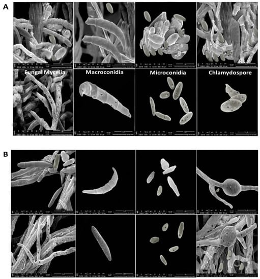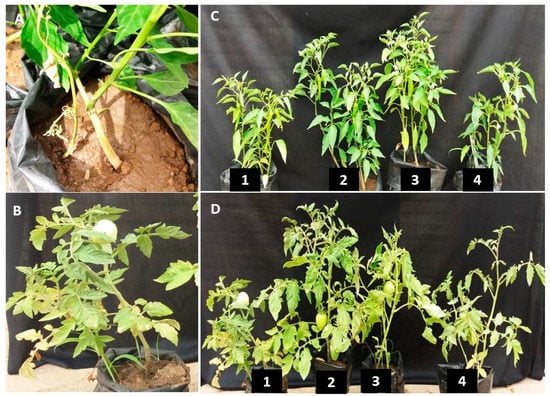 Fusarium wilt disease is a major challenge for vegetable production worldwide [,]. The disease caused by the pathogenic fungus Fusarium oxysporum is characterized by a deadly vascular wilt syndrome in solanaceous plants []. The fungus F. oxysporum is one of the most destructive soil-borne fungi that infect crops, particularly tomato, eggplant, pepper, and potato, because it has the potential to survive in the soil for more than two decades. Over one hundred and twenty different strains or formae speciales of F. oxysporum have been described so far, each one highly specific to a particular host in which it causes disease []. F. oxysporum f. sp. lycopersici (FOL) and F. oxysporum f. sp. capsici (FOC) cause Fusarium wilt in tomato and pepper plants, respectively. Also, F. oxysporum f. sp. radicis lycopersici (FORL) causes root rot disease, one of the most widespread fungal diseases in most African and Asian Mediterranean countries [].
