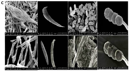 To further explore the interaction among rGO-CuO NPs and F. oxysporum, hyphae, macroconidia, microconidia, and chlamydospores from the three fungal isolates treated with 1 mg/mL of 5-nm rGO-CuO NPs were imaged by HR-SEM. In contrast to the untreated controls (Figure 5A–C, upper rows), SEM images showed dense rGO-CuO NPs aggregates on the outer layer of the fungal cells in all treated isolates (Figure 5A–C, lower rows). A number of irregular pits and pores could be observed on the cell wall surface of the hyphae, macroconidia, microconidia and chlamydospores of all three treated fungal isolates (Figure 5). The presence of pores and irregular cavities on the cell wall surface must cause significant damage. As illustrated in other studies, GO nanosheets tend to non-specifically wrap the microbial cells []. It was also suggested that CuO NPs might be interacting with molecules containing P and S either outside or inside the fungal cells []. Positively charged rGO-CuO NPs may bind to negatively charged fungal membranes, and this electrostatic attraction may cause disruption in the fungal cell wall functions with damage in the protein synthesis profile and the intracellular ion efflux, and finally resulting in fungal cell death []. Spores have been also shown to become deformed as a result of their intertwining by the thin GO sheets [,,].