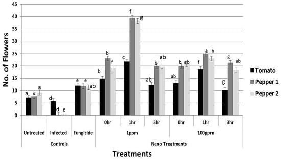 Effect of rGO-CuO NP treatments, as indicated, on flower increment in tomato and pepper plants (nine biological replicates). Two independent experiments with pepper plants are plotted. Letters on bars mean statistically significant differences between the mean of the respective control and the nanocomposite at the same concentration (p ˂ 0.05).