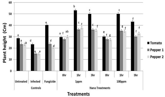 Effect of rGO-CuO NP treatments, as indicated, on plant height of tomato and pepper plants (nine biological replicates). Two independent experiments with pepper plants are plotted. Letters on bars mean statistically significant differences between the mean of the respective control and the nanocomposite at the same concentration (p ˂ 0.05).