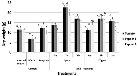 Effect of rGO-CuO NP treatments, as indicated, on dry weight of tomato and pepper plants (nine biological replicates). Two independent experiments with pepper plants are plotted. Letters on bars mean statistically significant differences between the mean of the respective control and the nanocomposite at the same concentration (p ˂ 0.05).