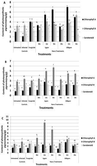 Effect of rGO-CuO NP treatments on photosynthetic pigments of treated (A) tomato and (B,C) pepper plants (nine biological replicates). Two independent experiments with pepper plants are plotted. Letters on bars mean statistically significant differences between the mean of the respective control and the nanocomposite at the same concentration (p ˂ 0.05).