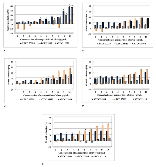 Growth reduction in case of S. epidermidis strains subjected to AgNPs, particle size 10 nm (A), 20 nm (B), 40 nm (C), 60 nm (D), 100 nm (E). The histograms provide the p-values obtained by ANOVA analysis. Post-hoc comparison results (Dunnett test, p < 0.05), are summarized with asterisks to underline the most relevant differences in Ag-NP-treated samples with respect to the control.