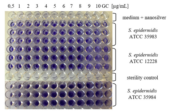 Assessment of BFA of S. epidermidis strains exposed to various concentrations of AgNPs, particle size 10 nm. From top to bottom, in rows: row 1: Tryptic Soy Broth (TSB) medium + nanosilver; rows 2–4: TSB medium + nanosilver + standard strain S. epidermidis ATCC 12228, rows 5–7: TSB medium + nanosilver + standard strain S. epidermidis ATCC 35983; row 8: TSB medium (sterility control); rows 9–11: TSB medium + nanosilver + standard strain S. epidermidis ATCC 35984. GC- growth control.