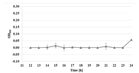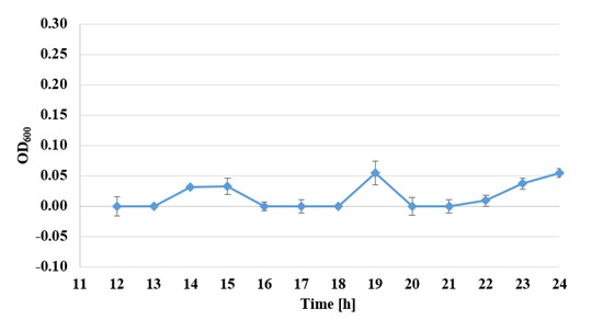 Changes of absorbance in Alamar Blue test for the strain S. epidermidis ATCC 35984, exposed to the activity of nanosilver particles with sizes of 10 nm and a concentration of 7 µg/mL between the 12th and 24th hour (λ = 600 nm).