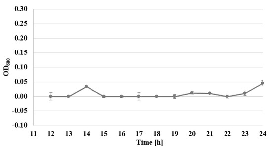 Viability assessment with the use of the Alamar Blue test demonstrated the inhibiting action of AgNPs, for all examined strains. For biofilm-forming strains, the bacteriostatic activity of AgNPs at a concentration of 2 µg/mL decreased even after the 14th hour of examination. The most pronounced activity affecting biofilm-forming strains was observed for the concentration of 7 µg/mL, where after 22–24 h of investigations, no viability of the examined biofilm-forming strains was detected (Figure 3, Figure 4 and Figure 5). The assessment of the viability of strains expose to AgNPs was also performed by Yu-Guo et al. [22]. In their studies, they analyzed the viability of S. aureus cells after the application of silver nanoparticles with a particle size of about 13 nm. The results even demonstrated a reduction in viability in the case of S. aureus cells, from the 4th to 24th hour after application of AgNPs.