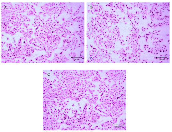 The image of cells of the GM03348 line in hematoxylin-eosin (H-E) stain at 100× magnification: (A) control, (B) exposed to silver nanoparticles, particle size 10 nm, concentration 5 µg/mL, (C) exposed to AgNPs, particle size 20 nm, concentration 5 µg/mL.