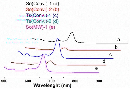 Chlorophyll spectra for: (a) So(Conv)-1, (b) So(Conv-2), (c) Ts(Conv)-1, (d) Ts(Conv)-2, and (e) So(MW)-1 extracts.