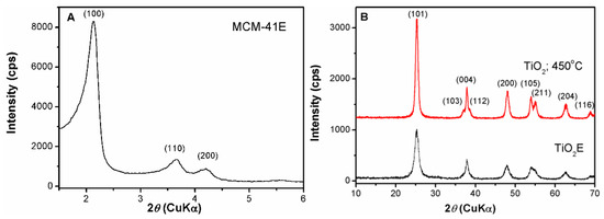 (A) Small-angle XRD analysis of MCM-41E and (B) wide-angle XRD patterns of TiO2E and TiO2 calcined at 450 °C.
