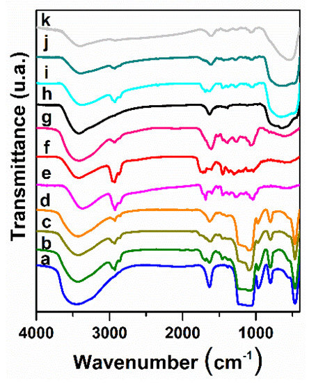 FTIR spectra for (a) MCM-41E; (b) So(MW)-1@MCM-41E; (c) So(Conv)-2@MCM-41E; (d) Ts(Conv)-2@MCM-41E; (e) So(MW)-1; (f) So(Conv)-2; (g) Ts(Conv)-2; (h) TiO2; (i) So(MW)-2@TiO2; (j) So(Conv)-2@TiO2; and (k)Ts(Conv)-2@TiO2.