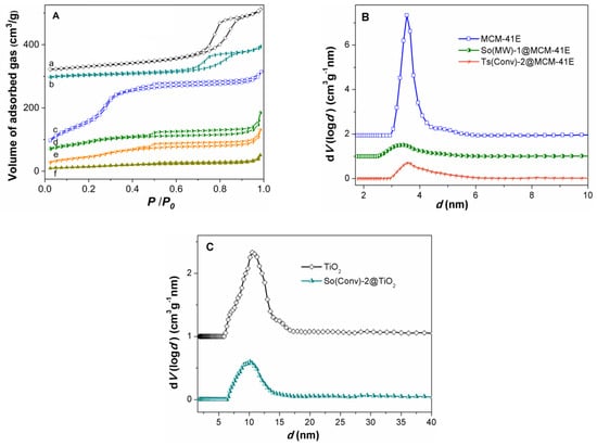 (A) N2 adsorption–desorption isotherms for: (a) TiO2; (b) So(Conv)-2@TiO2; (c) MCM-41; (d) So(MW)-1@MCM-41E, (e) Ts(Conv)-2@MCM-41E, and (f) So(Conv)-2@MCM-41E. (B) Pore size distribution curves for MCM-41E support, So(MW)-1@MCM-41E, and Ts(Conv)-2@MCM-41E. (C) Pore size distribution curves for TiO2 and So(Conv)-2@TiO2.