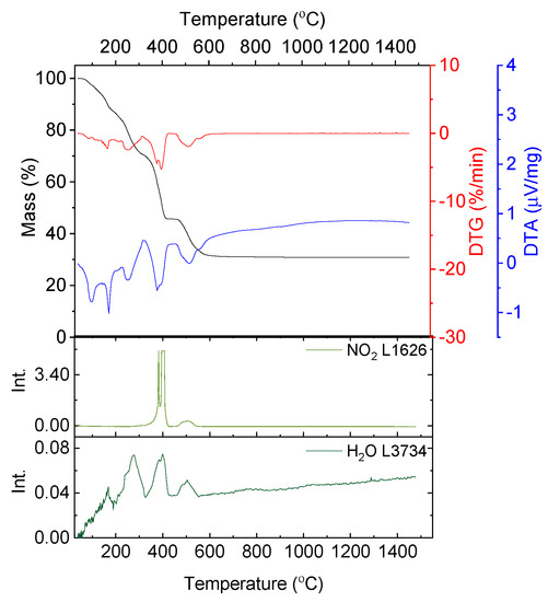 Thermal analysis results of the decomposition of yttrium nitrate hexahydrate in argon flow; absorbance intensities of traces for wavenumbers: 1626 and 3734 cm−1 corresponding with absorbance peaks of NO2 and H2O, respectively.