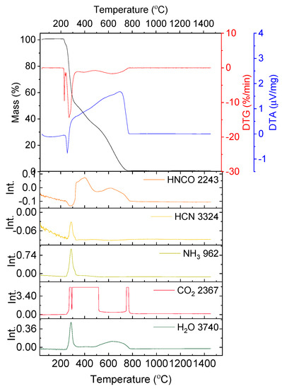 Thermogravimetric analysis was carried out in alumina crucibles using the thermal analyzer TG 449 F1 Jupiter (Netzsch Gerätebau GmbH, Selb, Germany). The gaseous products emitted were analyzed by FT-IR spectroscopy using a coupled FT-IR spectrometer (Tensor 27, Bruker, Billerica, MA, USA). The signals were identified based on the NIST database [23] and literature on glycine decomposition [24]. The curves of intensity of the characteristic absorbance wavenumber of a specific substance were subtracted and plotted as a function of temperature to investigate the reaction mechanism.