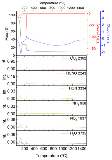 What is more, it was observed that below the redox reaction ignition point (238 °C) the presence of HCN, NH3 and NO2 was detected on FT-IR spectra (Figure 3). The specimens occur already at a temperature of about 124 °C.