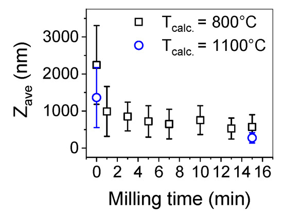 To deagglomerate the obtained powder high-energy milling was implemented. In Figure 5 the trend of cumulants mean vs milling time and in Figure 6 size distributions of the milled powders are presented.