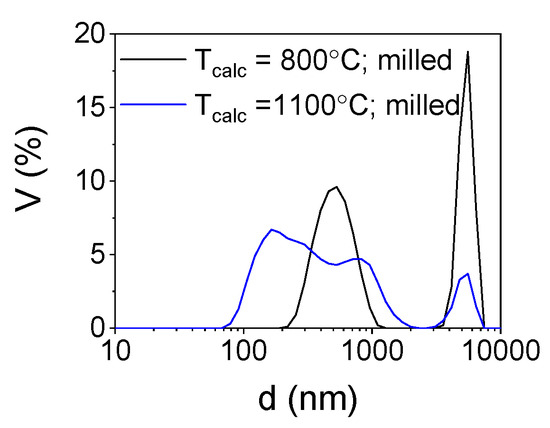 Powders calcined at a temperature of 1100 °C reveal a finely grained microstructure. The microstructure transformation occurs without mass loss (Figure 3). The fine (about 100 nm in diameter) grains occur in agglomerates, with Zave = 1338 nm and dV50 = 1190 nm. Together with agglomerate size, BET surface is decreased as well and equals 11.5 m2/g (Table 1). During calcination at a temperature of 1100 °C the disordered matter in nanostructures of high surface energy undergoes diffusion and reorganization into grains. The “sponge-like” structure undergoes conversion—its thin walls disappear and in its place uniform globular grains are produced. The specific surface decreases in the process of matter diffusion and grain formation, but the globular grains are connected by van der Waals forces or sintering necks. Such structure is more probable to disintegrate than the initial “sponge-like” aggregates which is portrayed in the DLS analysis. This kind of structure is still not beneficial for ceramic technology, as agglomerates are very difficult to densify during conventional pressing techniques and may cause fluctuations in density in the bulk of the pressed sample.