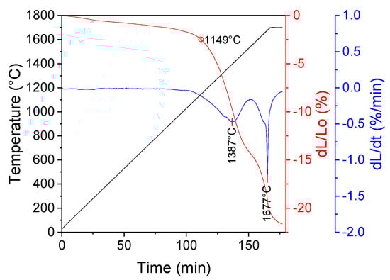 The sintering starts at a temperature of 1149 °C and proceeds in two steps: the first—with the maximum sintering rate at a temperature of 1387 °C (dL/L0 = 14.33%) and the second with the maximum sintering rate at T = 1677 °C (dL/L0 = 7.33%).