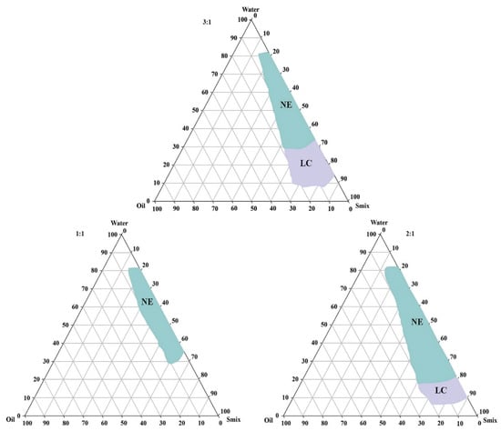 Pseudo-ternary phase diagrams demonstrating the influence of the Smix ratio (1:1, 2:1, and 3:1) on the nanoemulsion (NE) and liquid crystal (LC) regions.