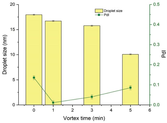 The effect of the vortexing time on the droplet size and PdI of NEs was investigated by preparing a series of NEs of fixed composition that were then vortexed for 0 (no vortexing), 1, 3, or 5 min. Results indicated that vortexing time was inversely related to the droplet size of the subsequent NE (Figure 2). Vortexing time also influenced the PdI of the NE, and decrease the value of PdI to a certain extent only afterward start increasing as shown in Figure 2.