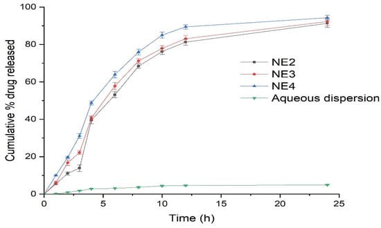 The in-vitro release of RT from the selected NE formulations (NE2-NE4) was performed using the dialysis bag technique for the duration of 24 h (Figure 3). The release of RT from the NE formulations was compared to the aqueous dispersion of pure RT.