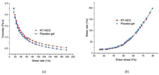 Rheological behavior of the retinyl palmitate-loaded nano-emulgel (RT-NEG) and placebo gel, demonstrating (a) viscosity versus shear rate and (b) shear rate versus shear stress.