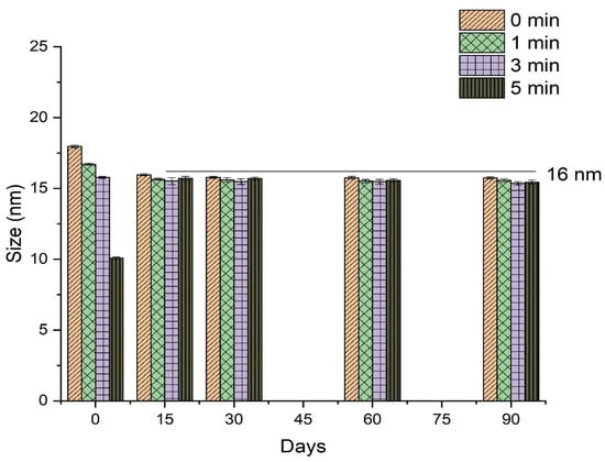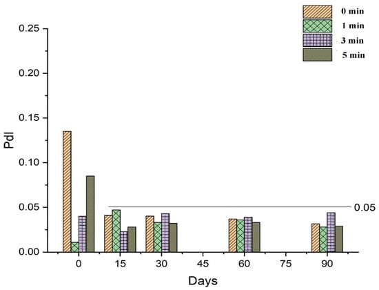 The stability of RT-loaded NEs prepared under different conditions (0, 1, 3, and 5 min of vortexing) was investigated during storage for 90 days by determining the droplet size and PdI throughout this time. As discussed in Section 3.2.1, the droplet size of freshly prepared NEs was influenced by variations in the vortex time, demonstrating an inversely proportional relationship as shown in Figure 6. Vortexing time also affected the PdI of the NEs, as a vortex time of 1 min decreased the value of PdI compared to no vortexing at all, while vortex times longer than 1 min progressively increased the value of PdI in freshly prepared samples, as shown in Figure 7. However, following 15 days of storage or more, values for mean droplet size and PdI remained relatively constant regardless of vortex time. These results indicate that NEs prepared by the low-energy method under different vortexing conditions reach an equilibrium stage after a specified period of time, after which the mean droplet size and PdI are no longer influenced by storage time.