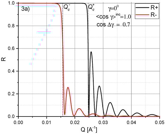 To exemplify our discussion so far, in Figure 2, a set of reflectivity curves , and are calculated for a 100 nm thick iron film deposited onto a silicon substrate and for magnetization vector orientations: (a) parallel to the axis Y, (b) tilted to the angle and (c) to the angle with respect to the Y axis. All reflectivities are shown on a linear scale for better visibility of the behavior close to the critical edges, instead of the more common logarithmic scale.