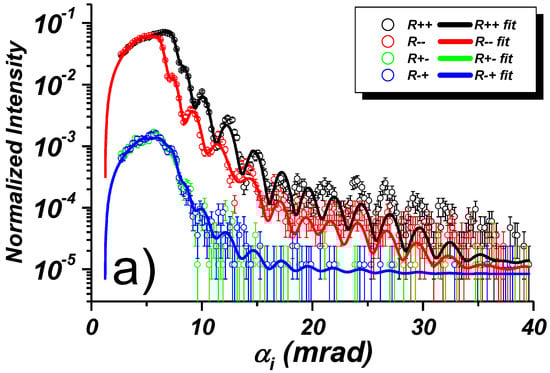It is also important to note that the averaging procedure over large domains does not affect the reflection amplitudes , which according to Equations (1)–(5) are determined by the SLDs . Here the magnetic SLD is proportional to the saturation magnetization, in accordance with Equation (3). Therefore, the location of the critical edges of total reflection