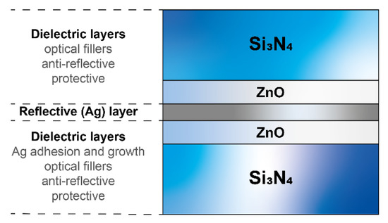 Glass is widely used in many applications such as optoelectronics, construction and decoration, medicine, automotive, aerospace, and solar energy harvesting [1,2,3,4,5,6]. Glass used in building and vehicle windows is often coated with low-emissivity multilayer thin films. These coatings offer high transmission and low emissivity, hence allowing more sunlight to pass through while blocking the infrared (IR) radiation to minimize undesirable interior heating. These low-emissivity (low-E) coatings are often formed by depositing a reflective layer (e.g., silver) onto the glass surface. To improve its electrical/optical properties, strongly depending upon its microstructure, and provide both adhesion and protection, several other layers are formed below and on top of the reflective layer, as shown in Figure 1. These layers are mostly dielectric hard materials such as silicon nitride (Si3N4), which is commonly used because of its transparency over a wide spectral range from the near ultraviolet (UV) to the infrared (IR) region, tin oxide (SnO2), and zinc oxide (ZnO), the latter mainly enhancing reflective layer adhesion and promoting microstructural characteristics that reduce its resistivity. These dielectric layers not only act as an optical filler and function as anti-reflective barriers to improve the optical properties, but also protect the stack from both the substrate and the environment. Both reflective and dielectric layers are normally produced using the physical vapor deposition (PVD) technique and the overall thickness of the stack is normally . Some typical configurations and properties for these layers are widely available in the literature [7,8,9].