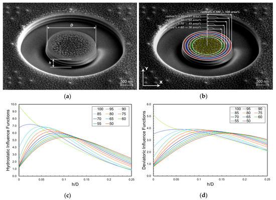A careful analysis of the strain distribution over the pillar surface during relaxation shows that the calculated influence function can be significantly different depending on the fraction of central pillar area that is selected for DIC analysis. In more detail, the area% for DIC is determined by selecting a certain percentage of the pillar’s radius (from here on called radius%, see Figure 2a,b). This corresponds to different sensitivity functions F(z/D) that are reported in Figure 2c,d, which show that a maximum exists for each of the sensitivity functions at the different values of the radius% selected for calculation. In order to avoid inaccuracies during stress calculation, a value of 80% was suggested to guarantee a sufficiently high strain sensitivity in the depth range of 0.015 < h/D < 0.2 for both the hydrostatic and deviatoric stress components.