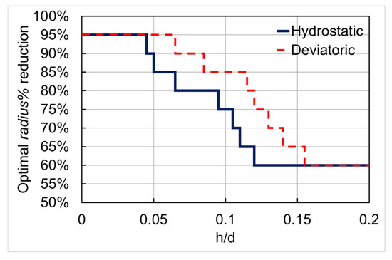 Optimal radius% (corresponding to area% for DIC) as a function of relative milling depth h/D (dashed line: deviatoric part, full line: hydrostatic part).