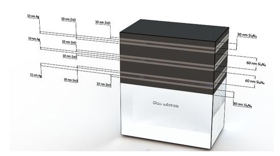 The coatings deposited for the present study are simplified (but representative) models of actual solar control low-E stacks, which normally consist of a multitude of thin films (see Figure 4). The stack has an overall thickness of 270 nm and is characterized by the following structure, starting from the substrate: glass substrate (6 mm)/silicon nitride (30 nm)/zinc oxide (10 nm)/silver (15 nm)/zinc oxide (10 nm)/silicon nitride (60 nm)/zinc oxide (10 nm)/silver (10 nm)/zinc oxide (10 nm)/silicon nitride (60 nm)/zinc oxide (10 nm)/silver (10 nm)/zinc oxide (10 nm)/silicon nitride (30 nm).