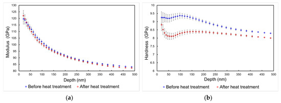 The results of nanoindentation and scratch testing for samples A (after heat treatment) and B (before heat treatment) are reported in Figure 7 and Table 1. It is apparent from the depth profiles presented in Figure 7a,b that in terms of the elastic modulus, no significant differences were observed between the two samples (Figure 7a). On the contrary, a statistically significant reduction in hardness is seen in the depth profile plot after heat treatment (Figure 7b). Film adhesion evaluated from nanoscratch results (Figure 7c) shows a reduction after heat treatment, as seen for the values of Lc2 (first adhesive failure) and Lc3 (full coating delamination) critical loads. In particular, a very significant difference in terms of Lc2 critical load is observed. The two failure events are visible in both cases from the SEM images reported in Figure 7c,d.